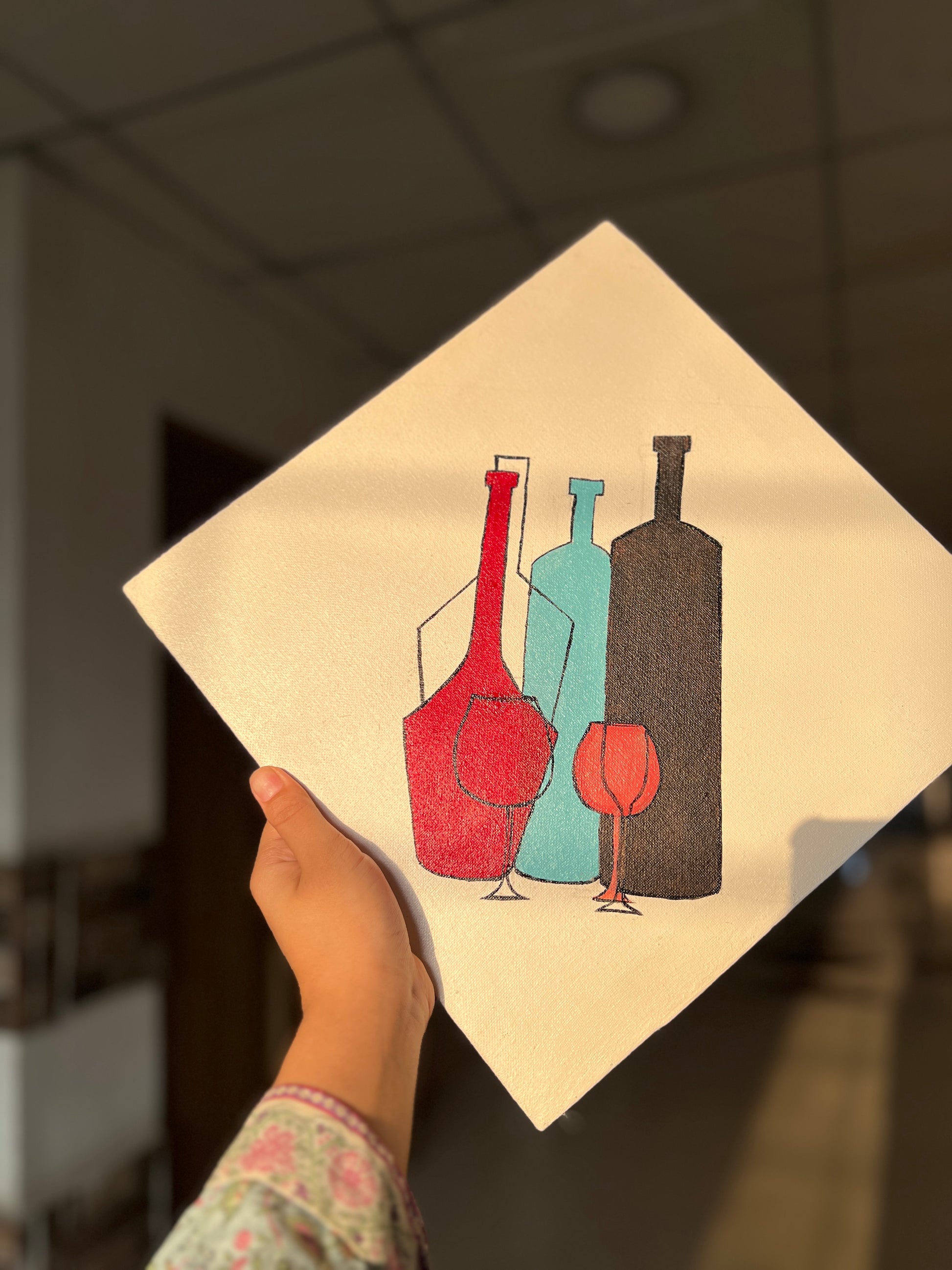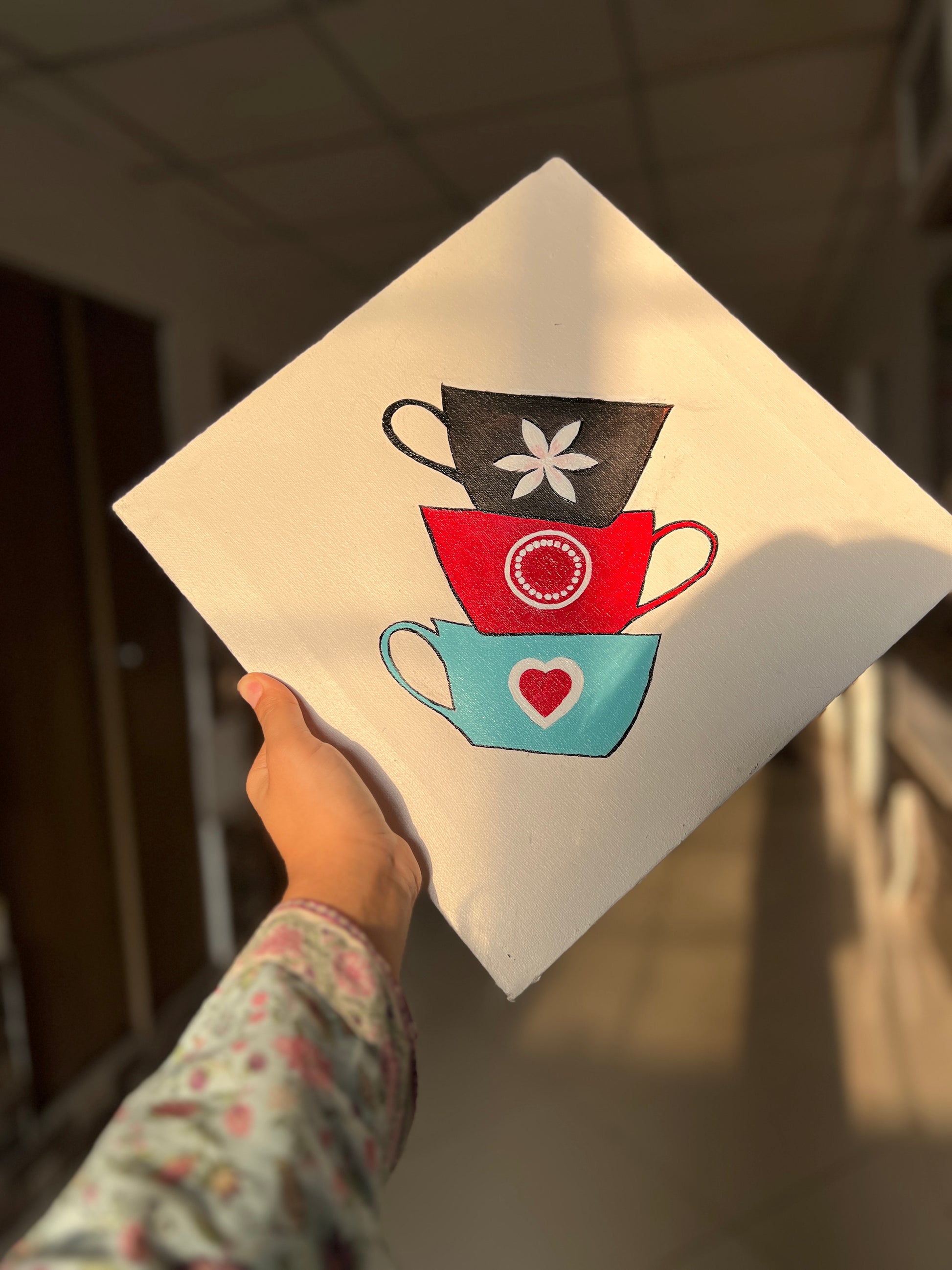 These diamond-shaped coasters feature playful designs perfect for adding a touch of art to your coffee table or hotel setup! One coaster showcases a trio of stylish bottles in red, teal, and brown, while the other displays a charming stack of teacups in blue, red, and black with cute details like a heart and flower. Hand-painted with love by @art.bylubaba 💛.