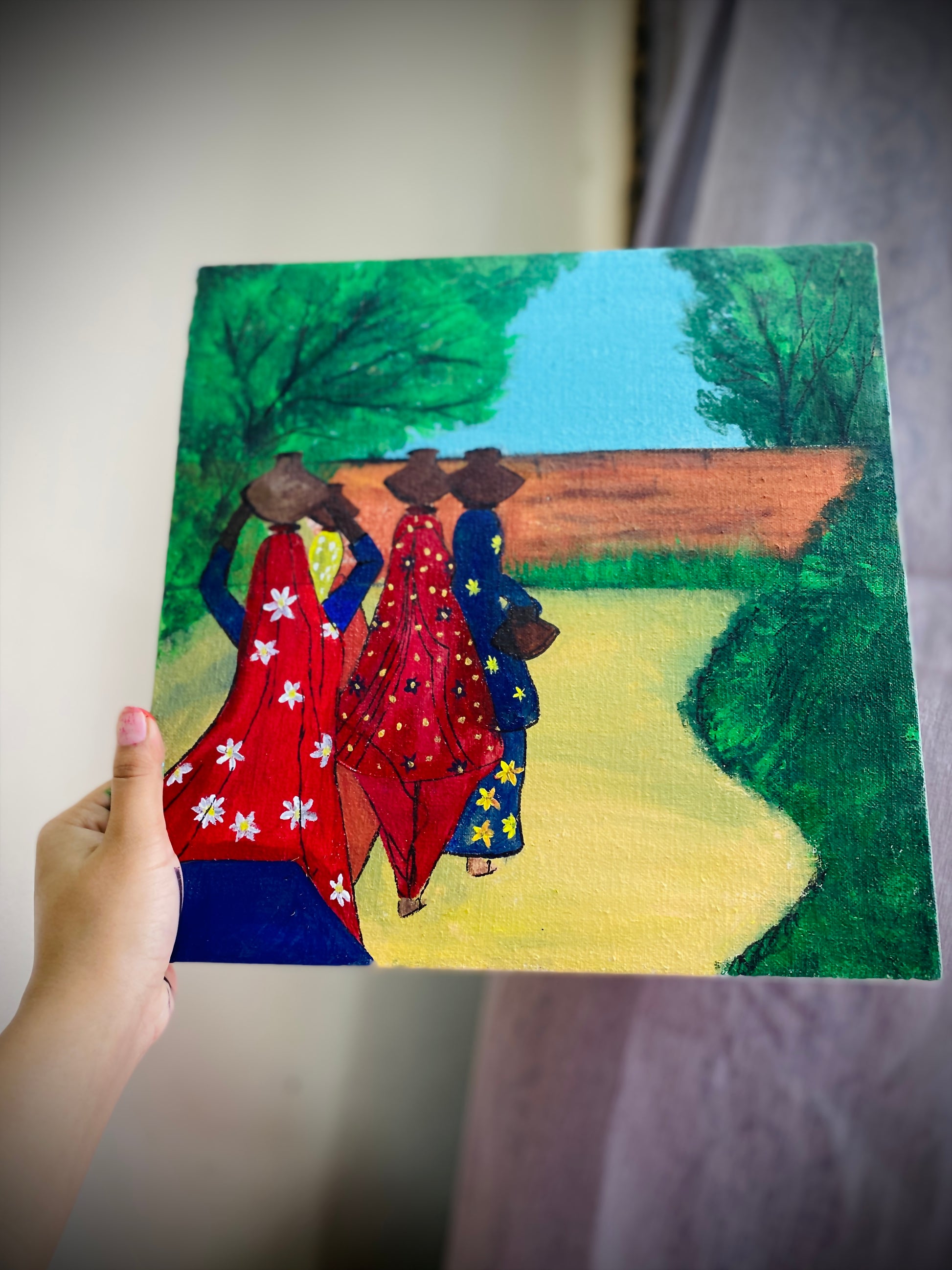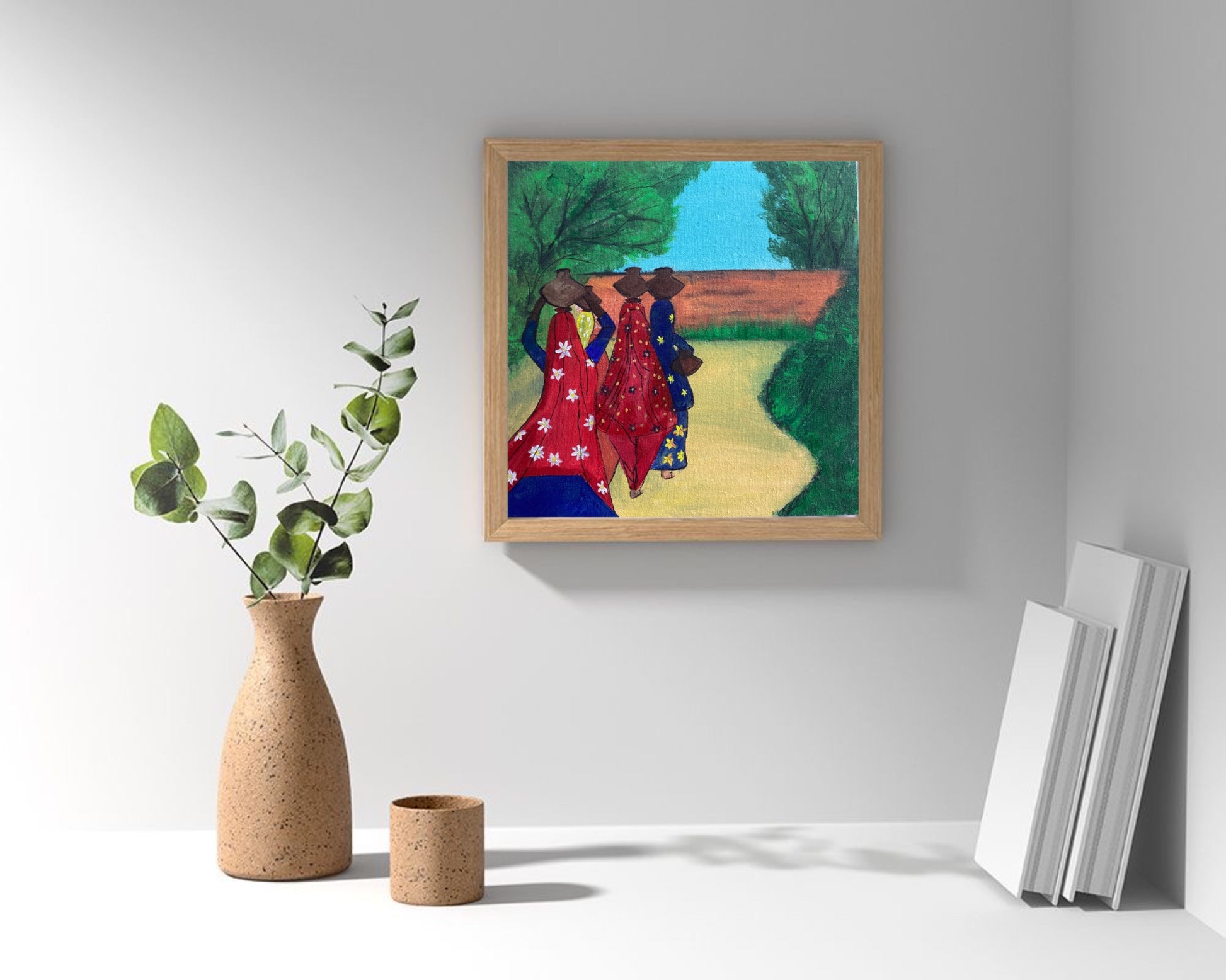 This vibrant acrylic painting depicts three women walking together in harmony, their figures set against a serene backdrop of trees and a clear blue sky. The women are dressed in traditional attire, with intricate details and colors that reflect their cultural heritage. The artist's use of bold brushstrokes and vivid colors brings the scene to life, capturing the elegance and poise of the women as they stroll along the path. The painting exudes a sense of warmth, community, and joy, inviting the viewer to step into the tranquil atmosphere.